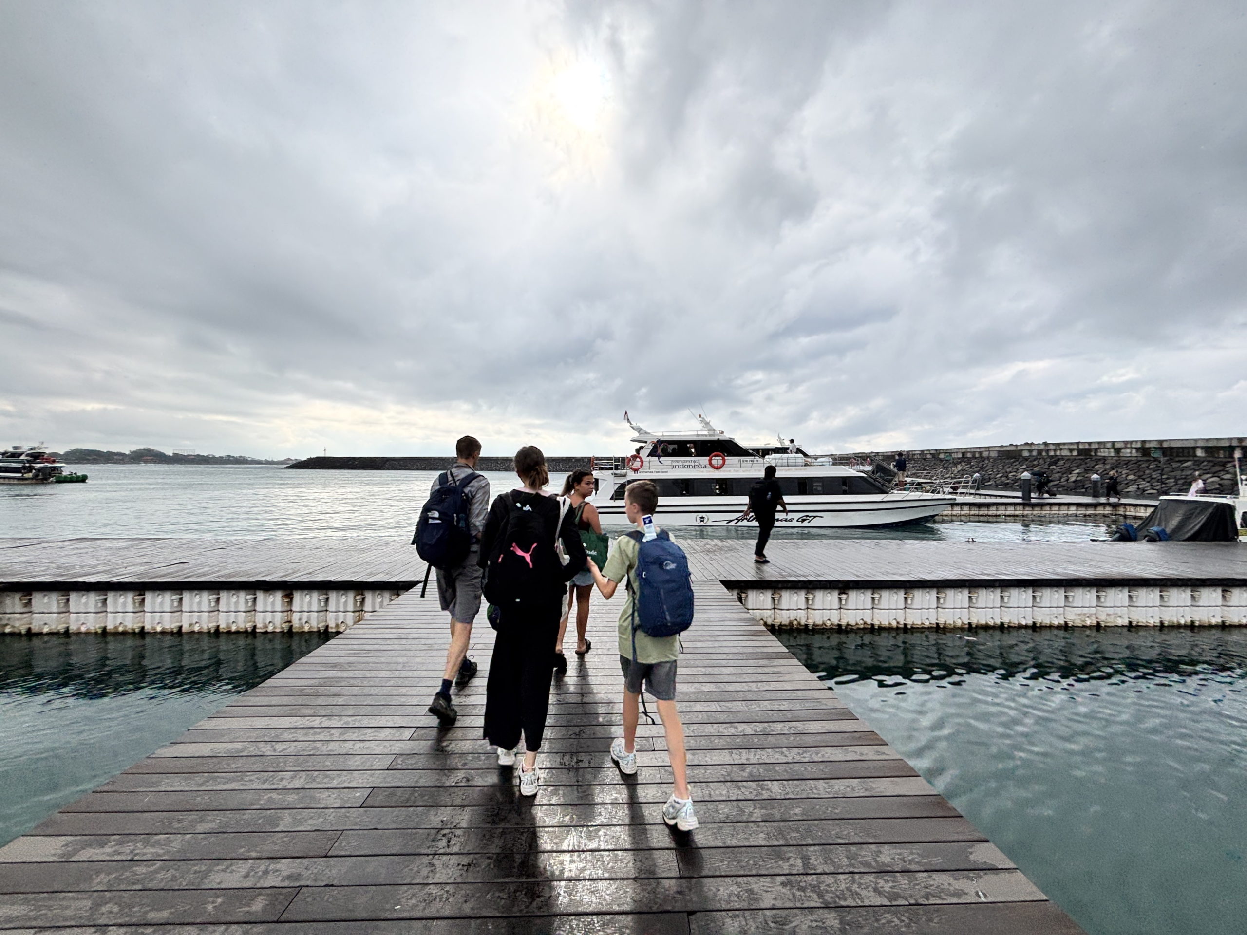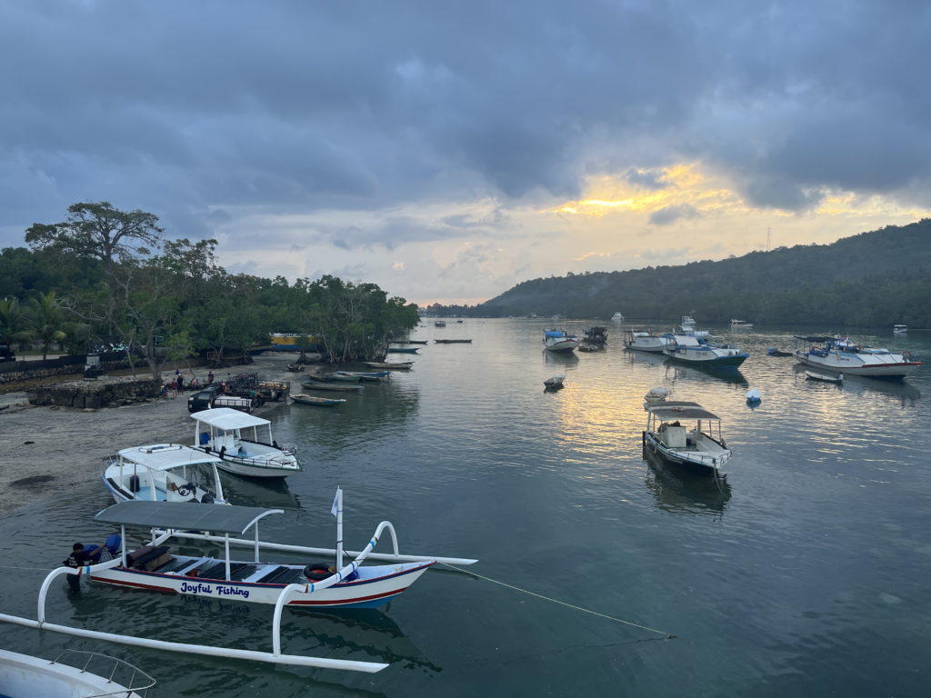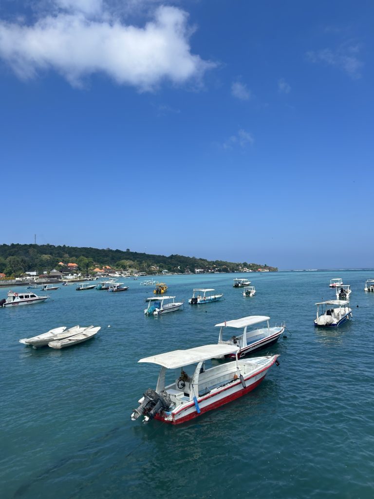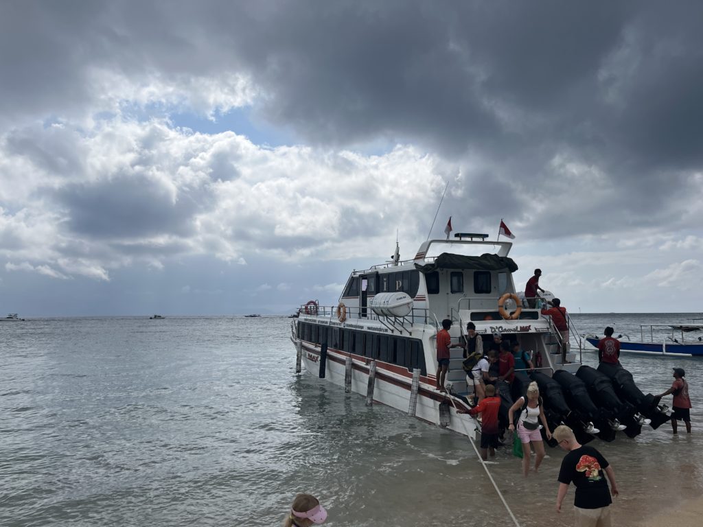 Nous embarquons en debout de matinée pour l’Ile de Nusa Lembongan. Le petit port grouille de voyageurs. Des montagnes de valises s’entassent un peu partout avec un ordre que seuls les balinais semblent maitriser.