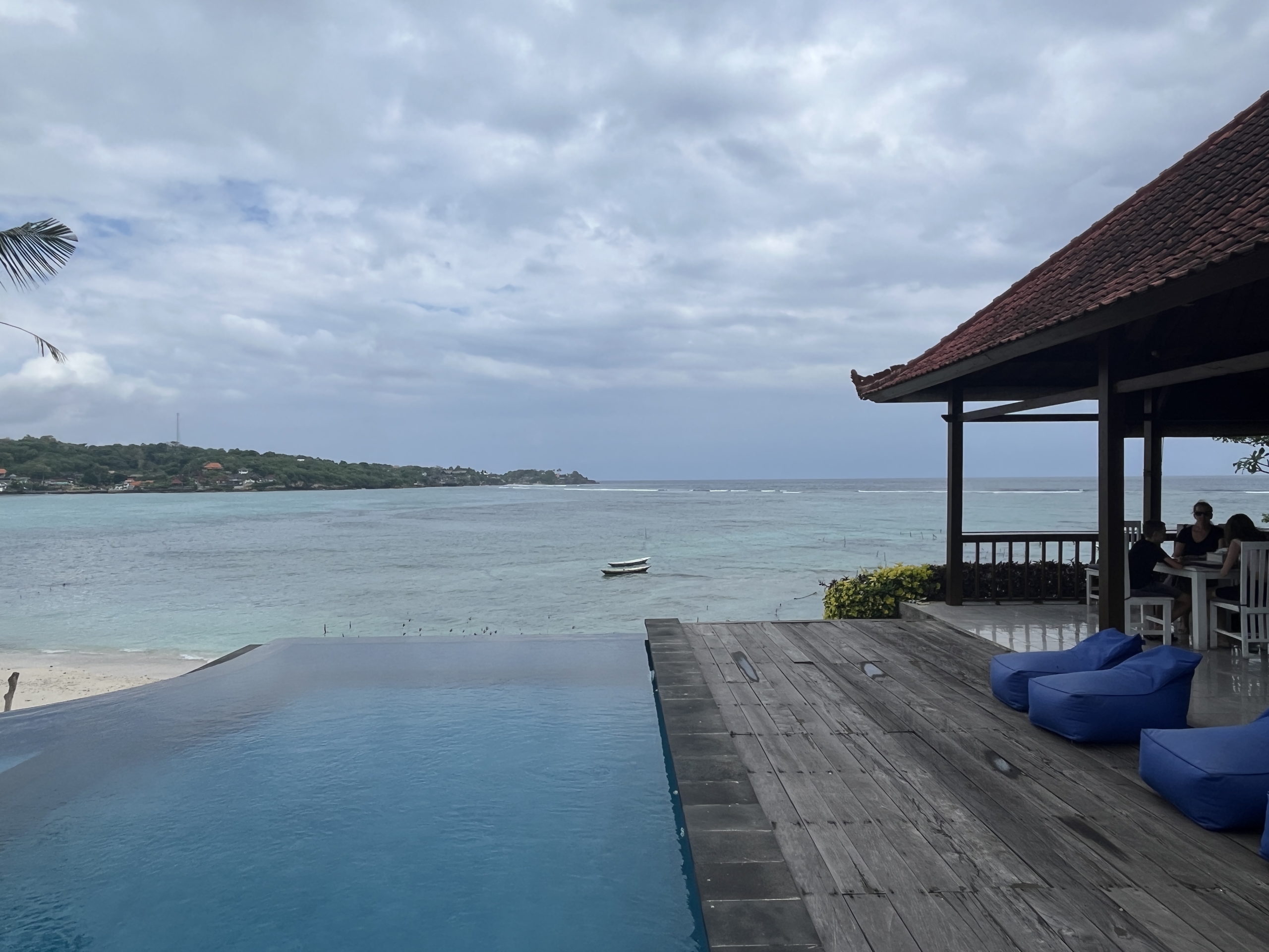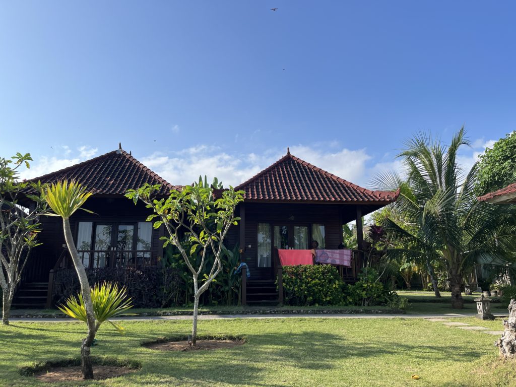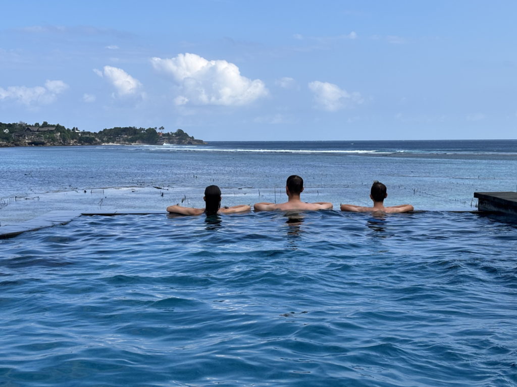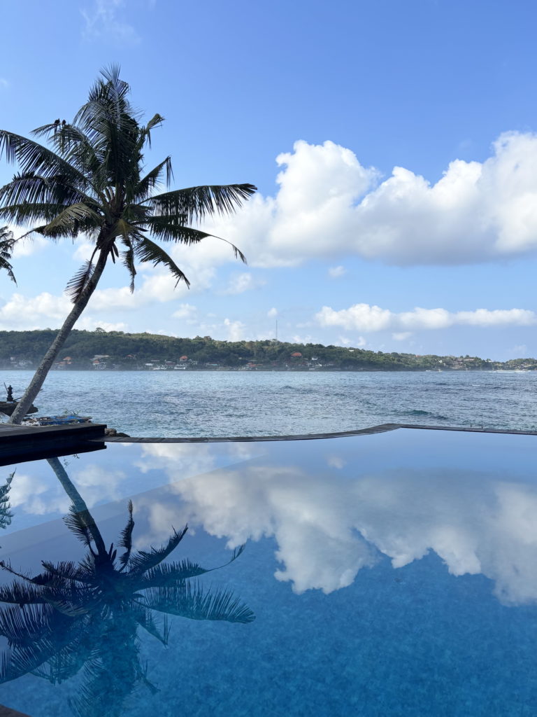 Nous sommes accueillis dans un petit hébergement de taille familiale au sud de l’île, l’hôtel Nusa Lembongan Seaview. Elle est équipée de notre piscine à débordement avec vue sur mer. On avoue, on adore 😉