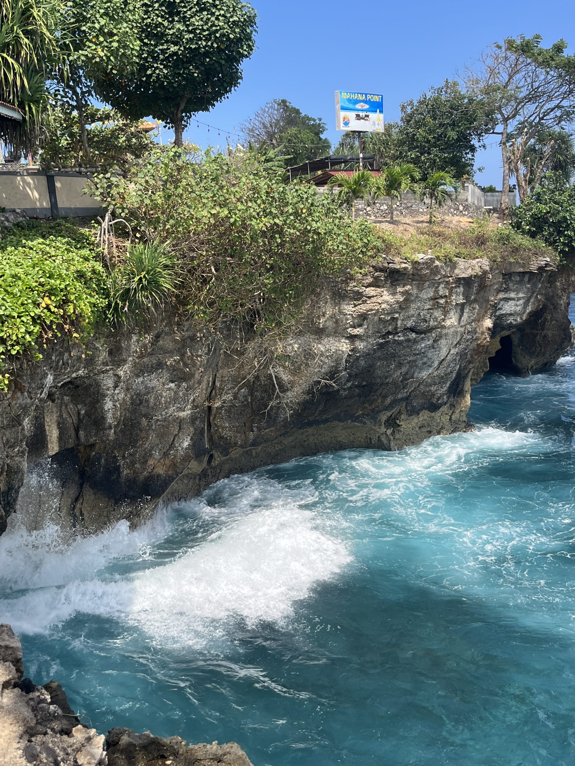 Un peu plus loin, la Pointe Mahana nous accueille pour un déjeuner bien mérité. Les vagues déferlent sur les falaises et atteignent par moment les tables du bar.
