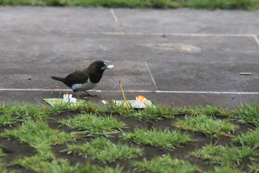 D’autres visiteurs apprécient les lieux… Les oiseaux se nourrissent des donations faites sur les petits autels chaque matin.