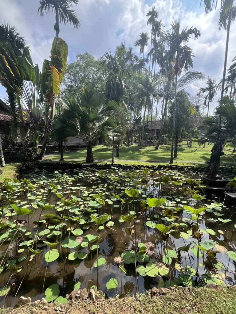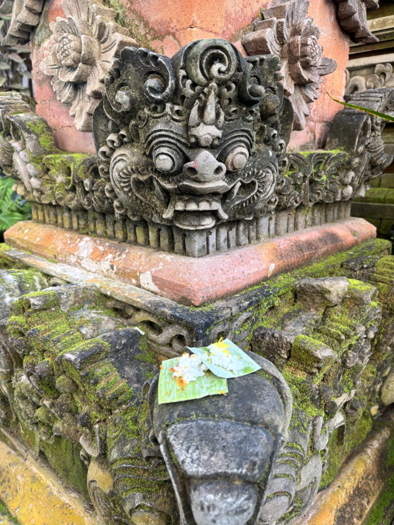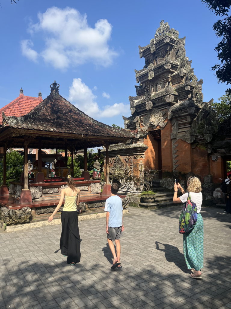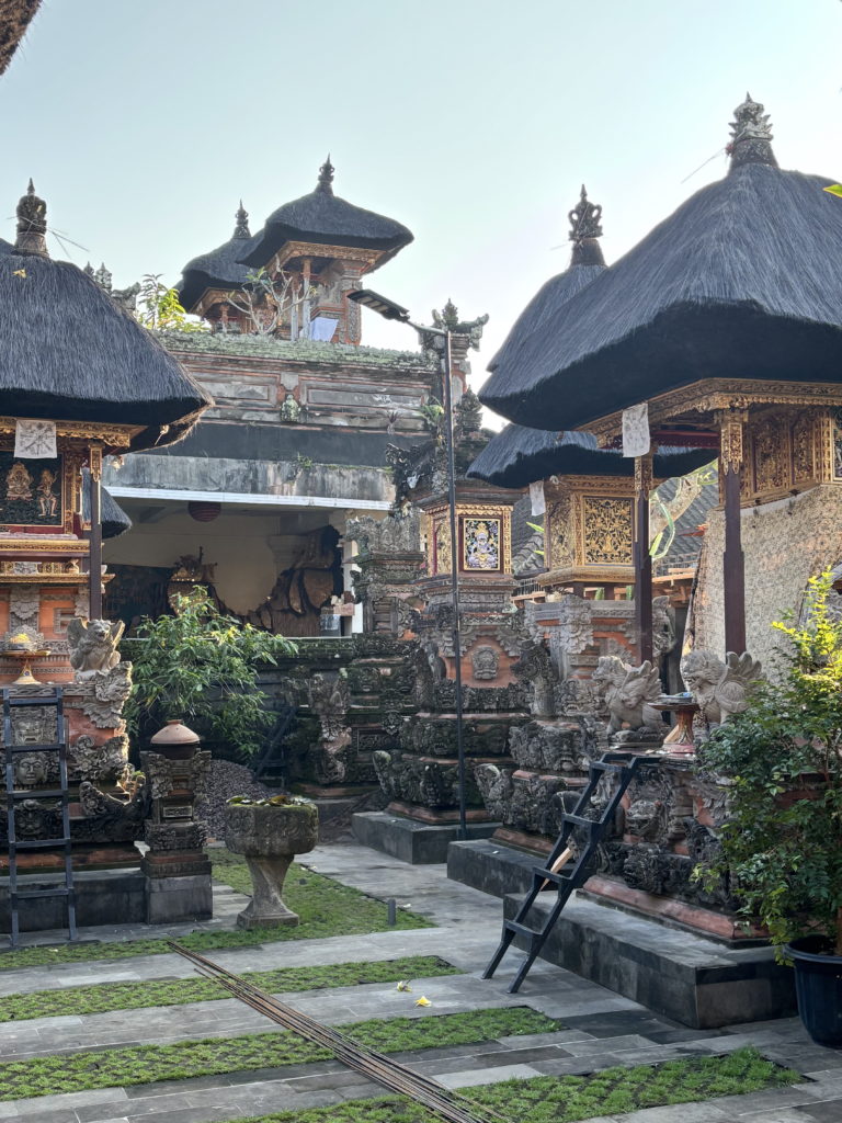 Nous profitions d’un matin très zen, après la foule des rues Ubud, centre culturel et touristique de Bali. Nos chambres chez l’habitant se situent autour du temple familial, qui est au coeur de la maison des propriétaires.