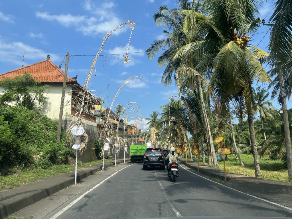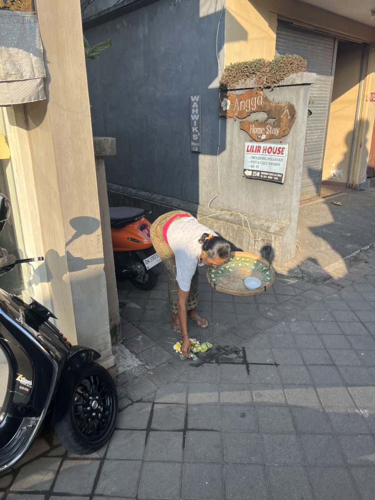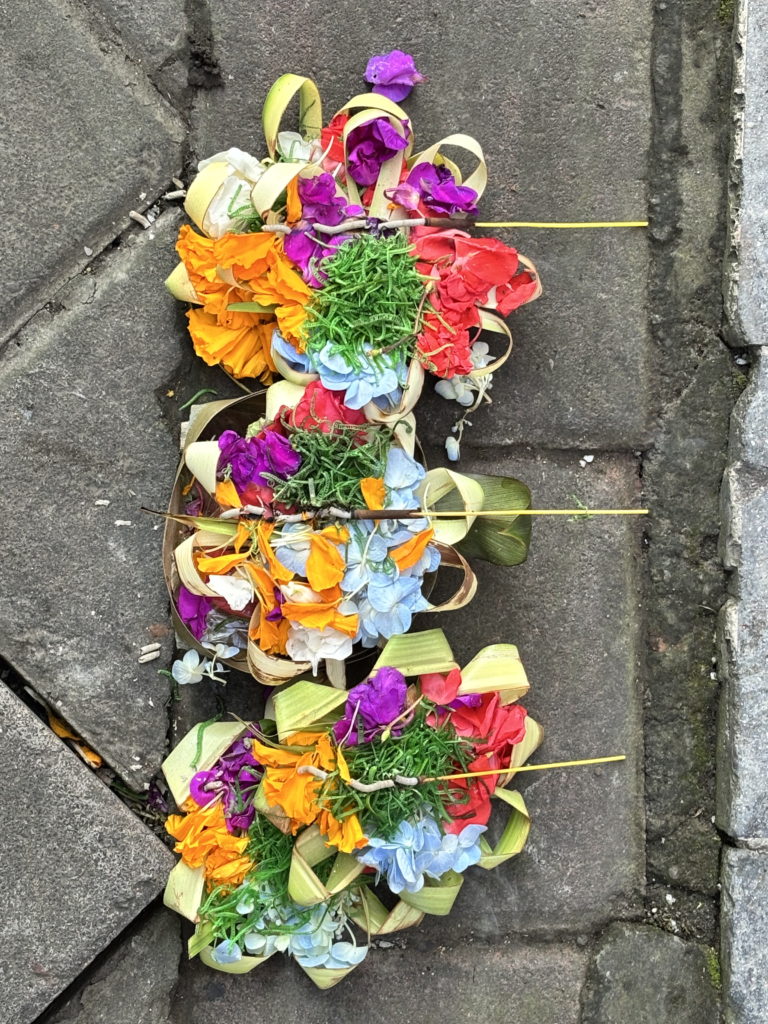Chaque matin les balinais hindous font des offrandes au temple, aux motos, à la maison, aux arbres, aux voisins… Une feuille de palmier tressée, quelques fleurs colorées, un peu de riz, du café… Le tout dans un rituel matinal immuable. C’est un moment de communication avec le monde spirituel. Ces offrandes apaisent les esprits et apportent prospérité et bonne santé à la famille.