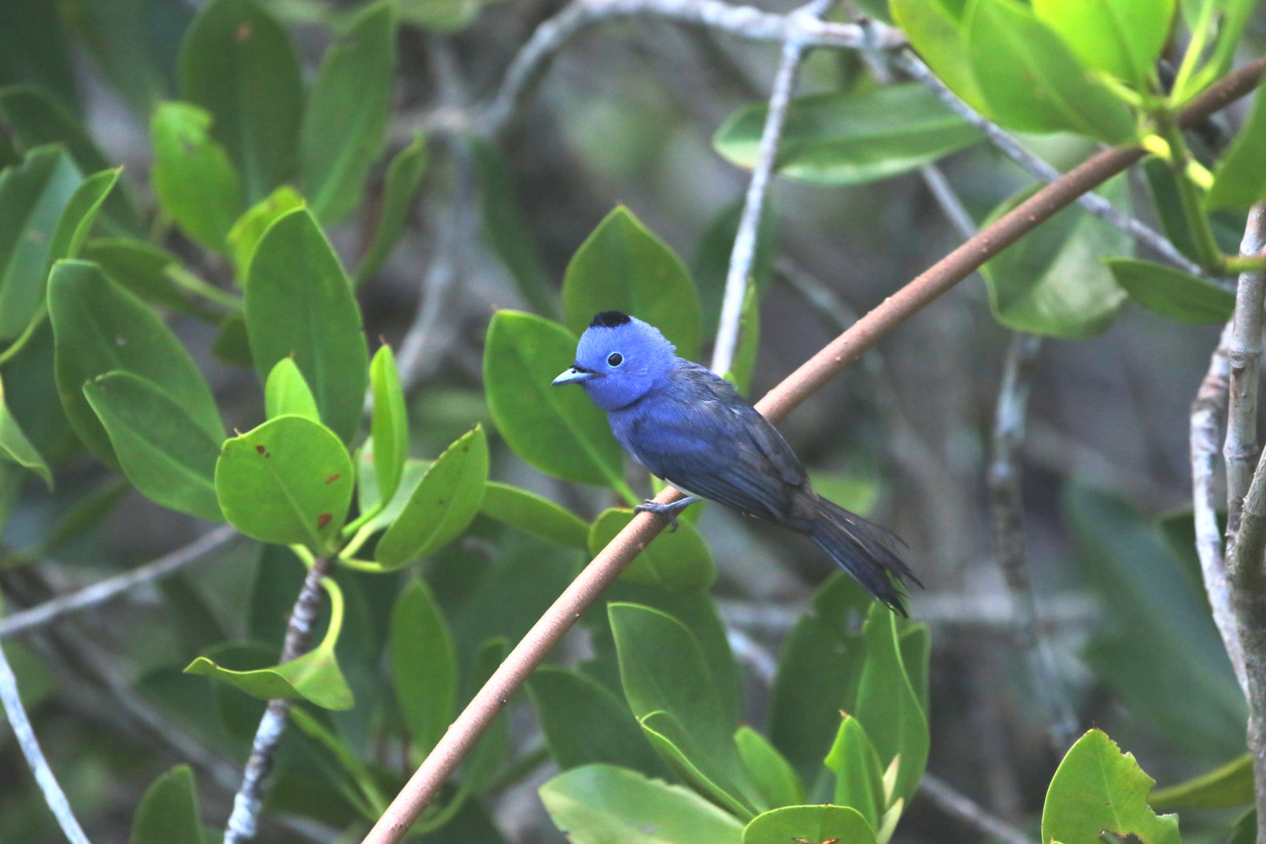 … mais avec un peu de patience, c’est un autre belle récolte pour mon appareil photo : le splendide Tchitrec azuré, bel oiseau bleu de la famille des Gobemouches se pose sur une branche à proximité.